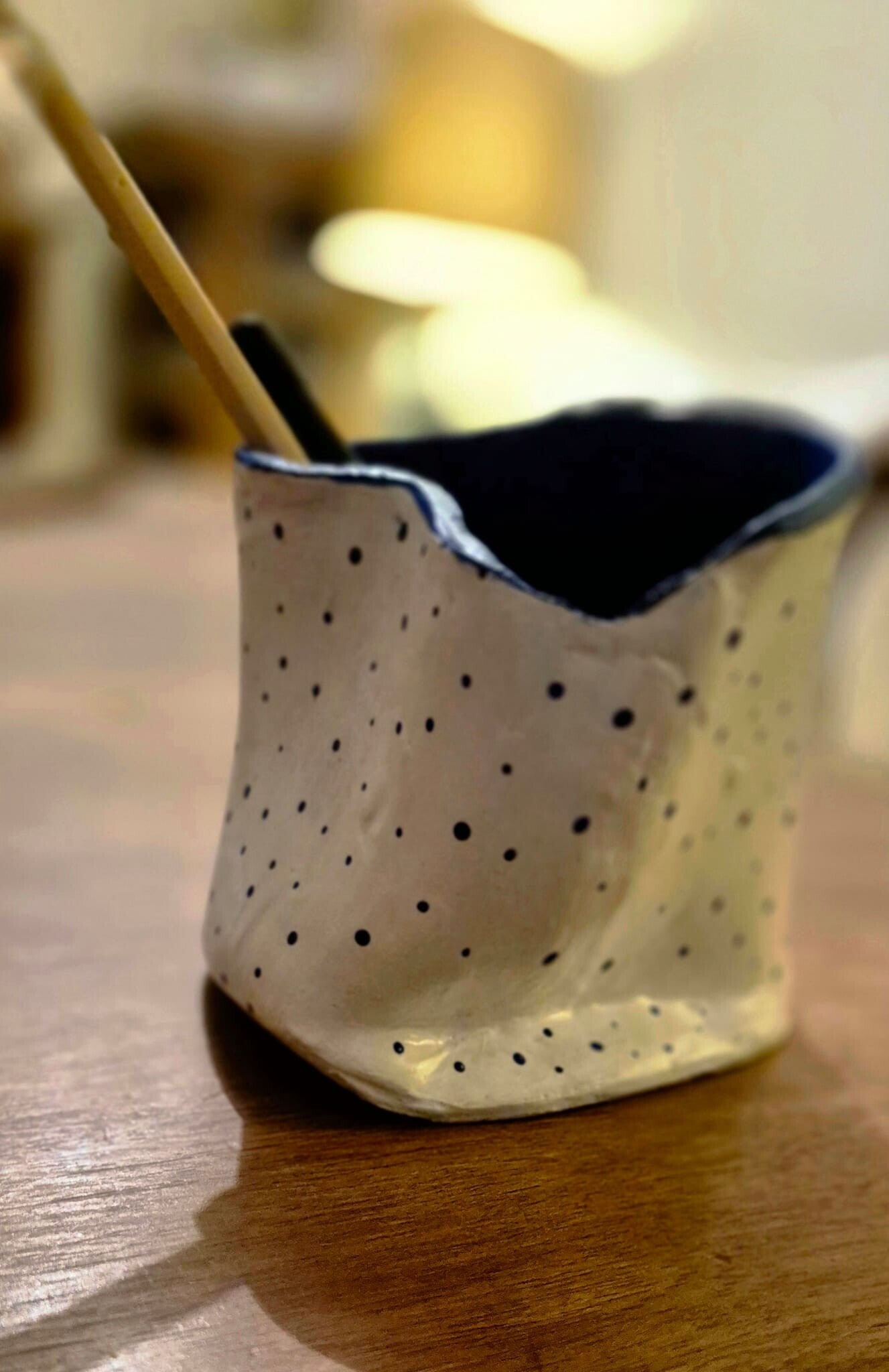 Une fine dentelle en dessine le bord, comme un murmure ancien, une caresse d'atelier, ou encore une forme déstructurée ornée de pois bleus... Les possibilités sont infinies.. Chaque courbe, chaque trace du pinceau raconte la tendresse du geste, les imperfections charmantes du fait main...